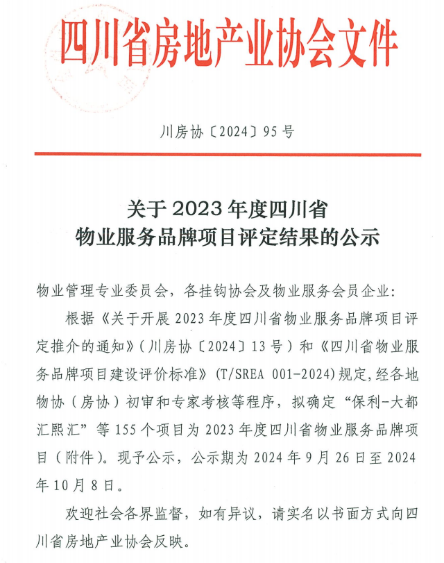 成都国机西南大厦通过积极申报,经过市级、省级两次严格评审,准备上百份检查资料,陪同评审专家审核检验,最终于2024年9月26日由四川省房地产业协会 发布文件公布相关信息,此次荣获“2023年度四川省物业服务品牌项目”。