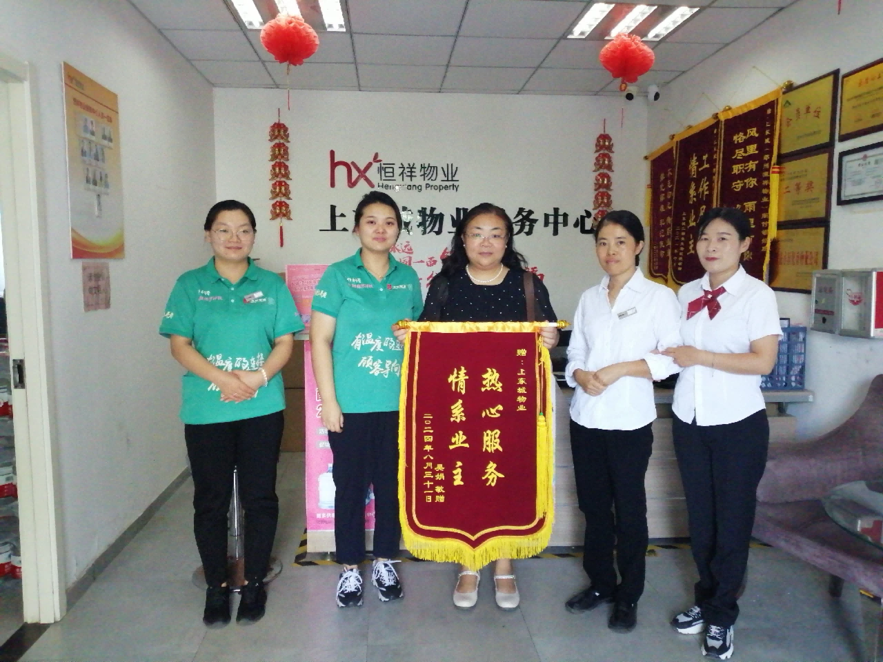 该户业主因房屋出租,家政保洁、水电风一系列问题,由于业主不能到场,都是由物业管理处和工程上门处理!特此定制一面锦旗,赠送给管家杨敏,工程师傅权天怀、张江鱼,为之平管理的服务点赞,为管家及工程师傅的专业点赞!